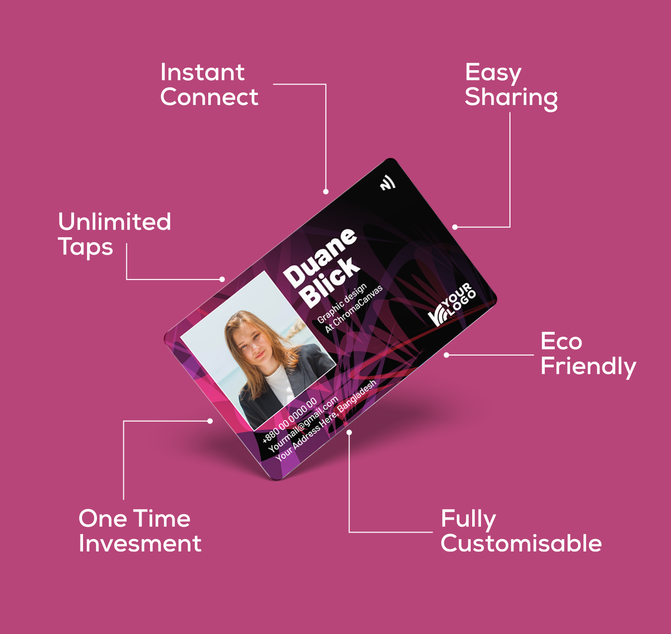 আমাদের রিচকার্ড-এ রয়েছে অন্তর্নির্মিত ট্যাপ প্রযুক্তি এবং পিছনে একটি গতিশীল QR কোড, যা আপনাকে আপনার তথ্য একসাথে দ্রুত এবং সহজে শেয়ার করতে সাহায্য করে।