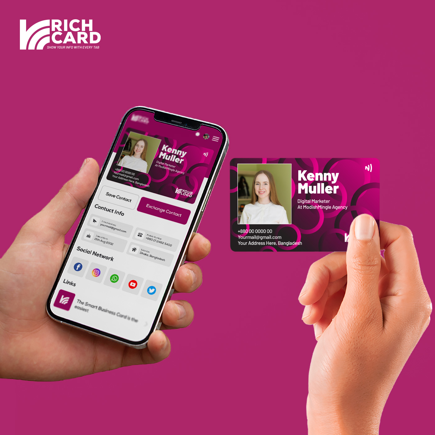 আমাদের রিচকার্ড-এ রয়েছে অন্তর্নির্মিত ট্যাপ প্রযুক্তি এবং পিছনে একটি গতিশীল QR কোড, যা আপনাকে আপনার তথ্য একসাথে দ্রুত এবং সহজে শেয়ার করতে সাহায্য করে।